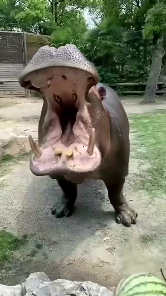 这个视频的主角,是一只生活在非洲野生动物园的河马。它不仅长相可爱,而且有着一颗吃货的心。在视频中,河马看到大王瓜的那一刻,眼神里充满了期待。它小心翼翼地靠近,然后张开大嘴,一口咬下。那样子,简直就像是个贪吃的小孩子。